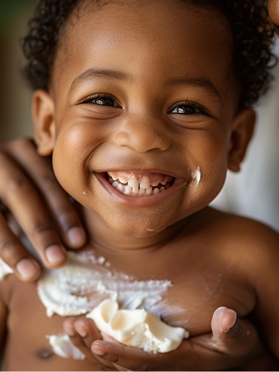 Rich lipids from shea, cocoa and mango butter seal the skin barrier, preventing moisture loss and allergen entry.